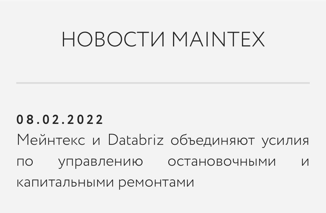 Компания «Мейнтекс», входящая в холдинг ОМЕГАЛЬЯНС, и российский разработчик решений в области управления остановочными и капитальными ремонтами DATABRIZ заключили партнерское соглашение. Целью сотрудничества является реализация совместных проектов в области процессов управления основными фондами.