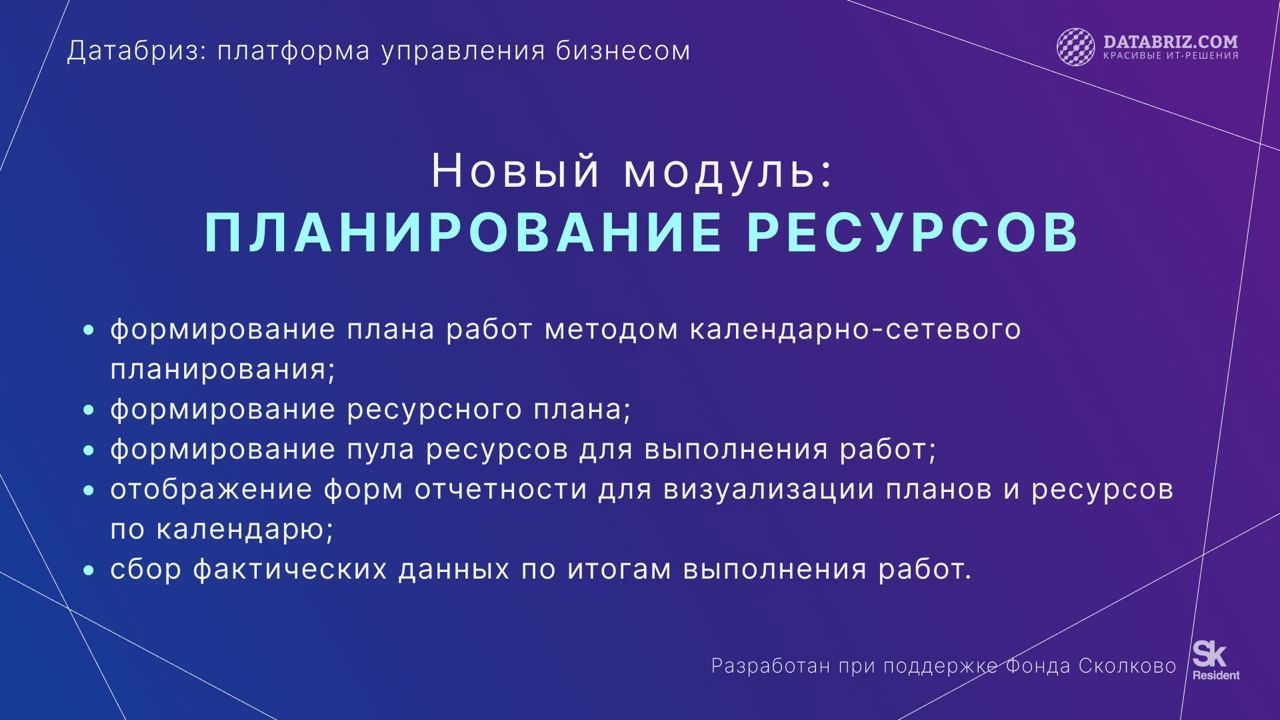 Новый модуль, разработанный при поддержке фонда Сколково, расширяет функционал программного продукта «Датабриз: планирование ресурсов», дает возможность пользователям детально управлять ресурсами предприятия, что в значительной мере сокращает риск срыва сроков инвестиционных проектов и сокращает издержки наших заказчиков при проведении ремонтов.