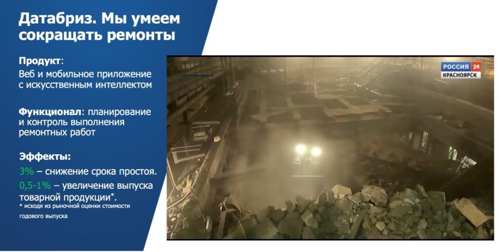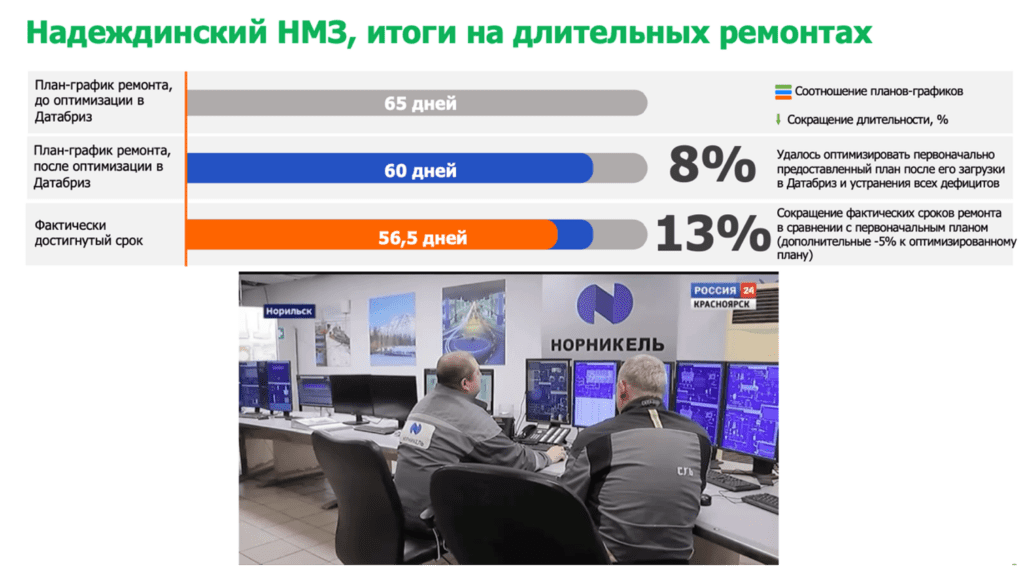 На конференции группа компаний Норильский Никель предоставила доклад с опытом применения системы управления остановочными ремонтами на одном из планово-предупредительных ремонтов ГРК Быстринский: ООО «Датабриз» предложило программный продукт собственной разработки, с доработанным в 2022-начале 2023 года на средства Фонда Сколково модулем планирования ресурсов, что позволило Заказчику:
