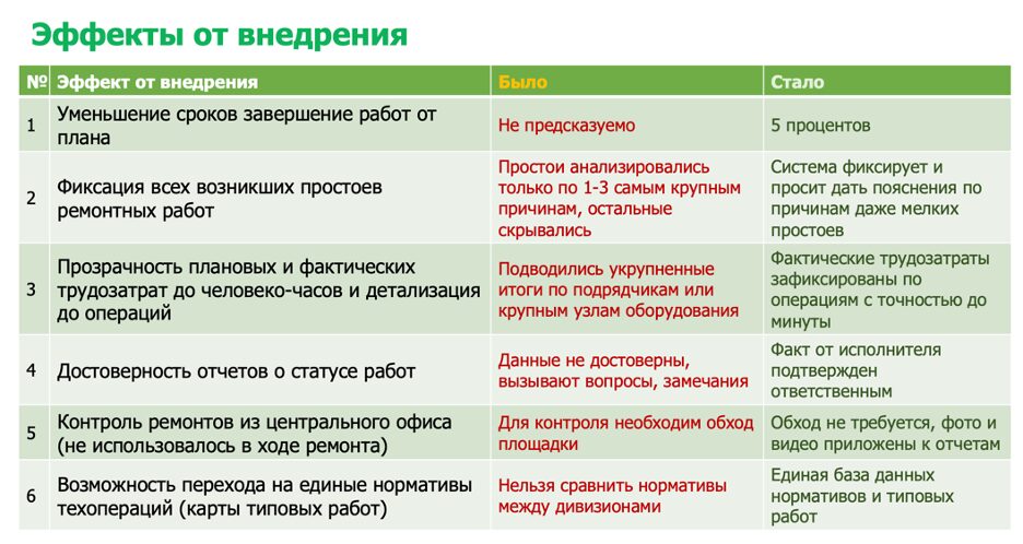 Система позволила «СИБУР-Химпрому» оперативно определять текущий статус по всем ремонтам, формировать статистику в реальном времени, актуализировать и контролировать графики работ, планировать человеческие и механизированные ресурсы, сократить трудовые затраты (сэкономлено более 700 человеко-часов), высвободить трудовые ресурсы от заполнения отчетности (180 человеко-часов).