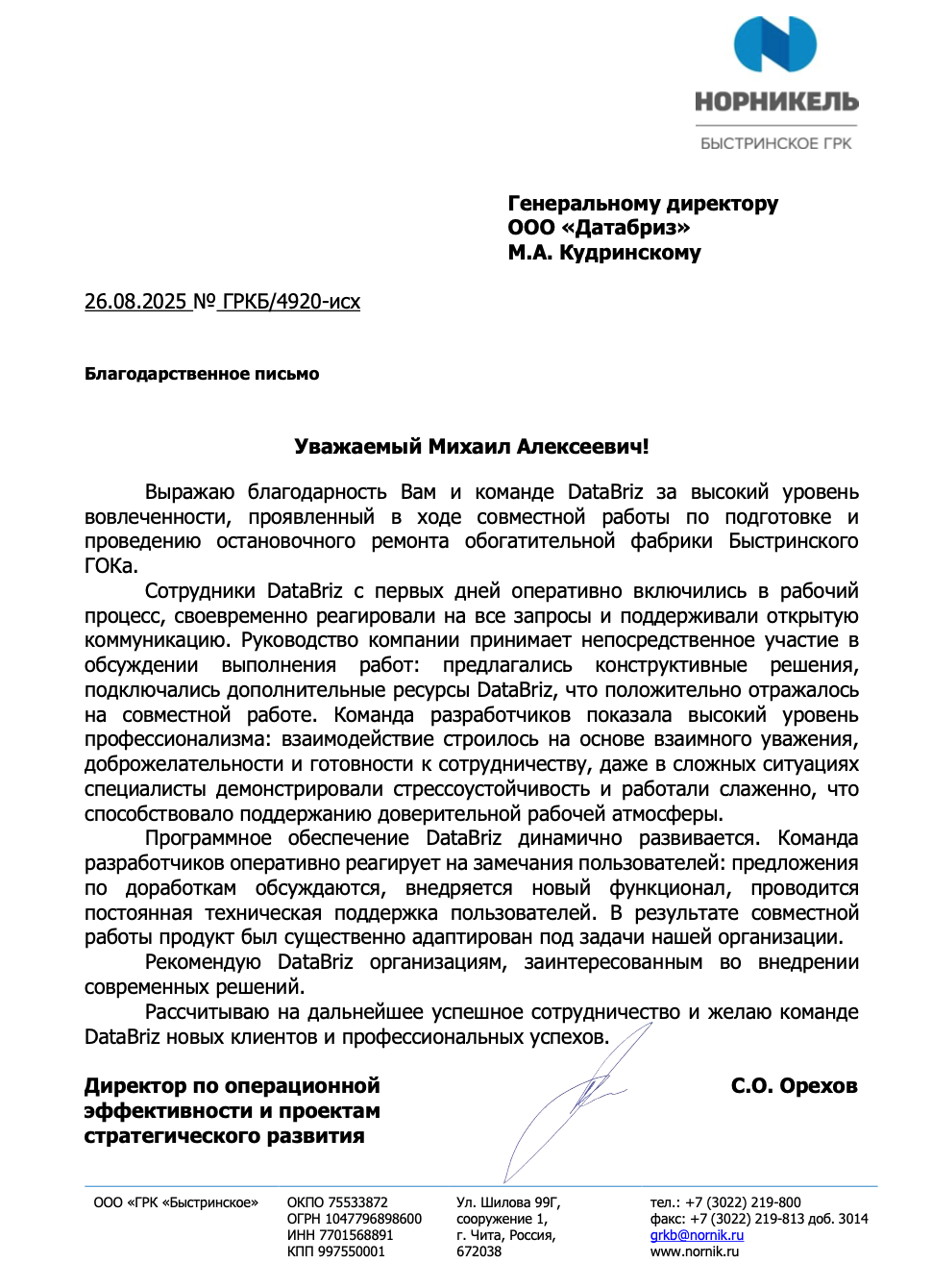 Наша команда получила от клиента ГРК Быстринское (Норильский Никель) благодарственное письмо и положительный отзыв о работе и программном продукте Датабриз! Для нас такая обратная связь — самая ценная награда! Она означает, что мы на правильном пути и наше решение действительно помогает бизнесу наших клиентов становиться эффективнее!