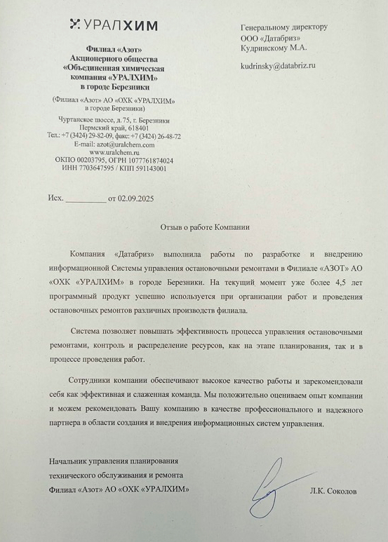 Мы получили положительный отзыв о нашем продукте от Филиала «Азот» ОХК «УРАЛХИМ» в г. Березники. Заказчик отмечает, что система позволяет повышать эффективность процесса управления остановочными ремонтами, контроля и распределения ресурсов.